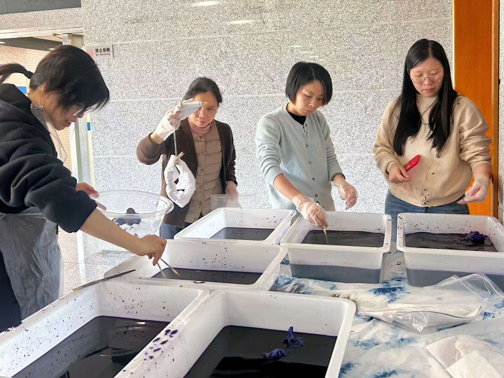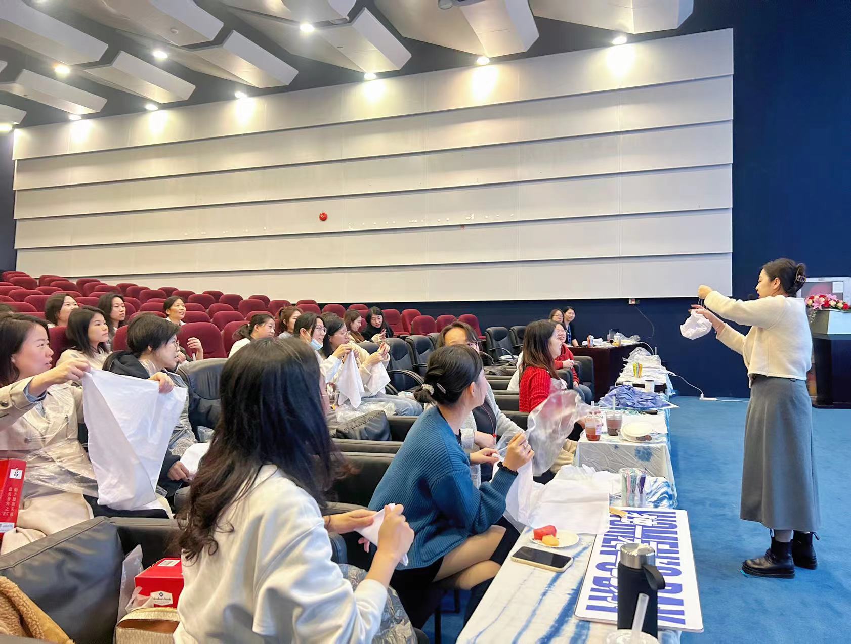 “巧手扎錦繡,靛藍(lán)染繁花”,扎染活動(dòng)進(jìn)入正題,大家先對(duì)扎染的歷史淵源、發(fā)展脈絡(luò)、制造技藝有了深入了解,并通過(guò)一系列風(fēng)格迥異的扎染藝術(shù)作品,激發(fā)了濃厚的創(chuàng)作熱情。隨后,大家通過(guò)夾扎法和捆扎法,發(fā)揮想象力和創(chuàng)造力,親自設(shè)計(jì)、結(jié)扎并染色,制作出獨(dú)具特色的扎染作品。