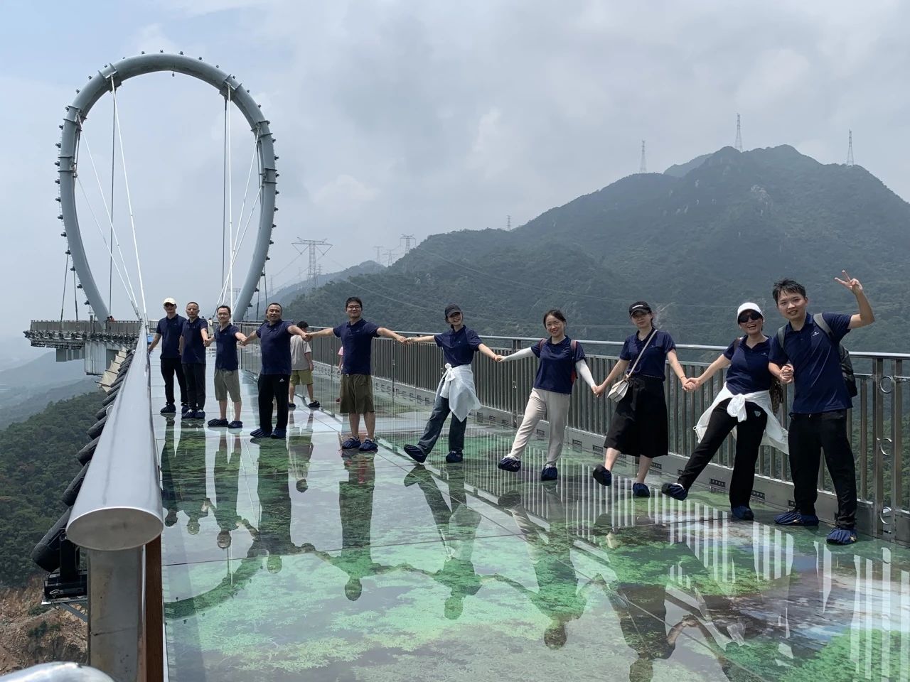 在藍(lán)天白云的映襯下,玻璃棧道宛如一顆璀璨的明珠鑲嵌在翠綠的山林之中;人事行政部的同事們毫不畏懼,攜手向前,繼續(xù)挑戰(zhàn)極限,走在玻璃棧道上,隨著每一步的前行,山谷與綠樹(shù)都在視野中展現(xiàn)得如詩(shī)如畫,仿佛置身于云端,讓大家感受到了大自然的壯麗恢弘與人類的智慧結(jié)晶。